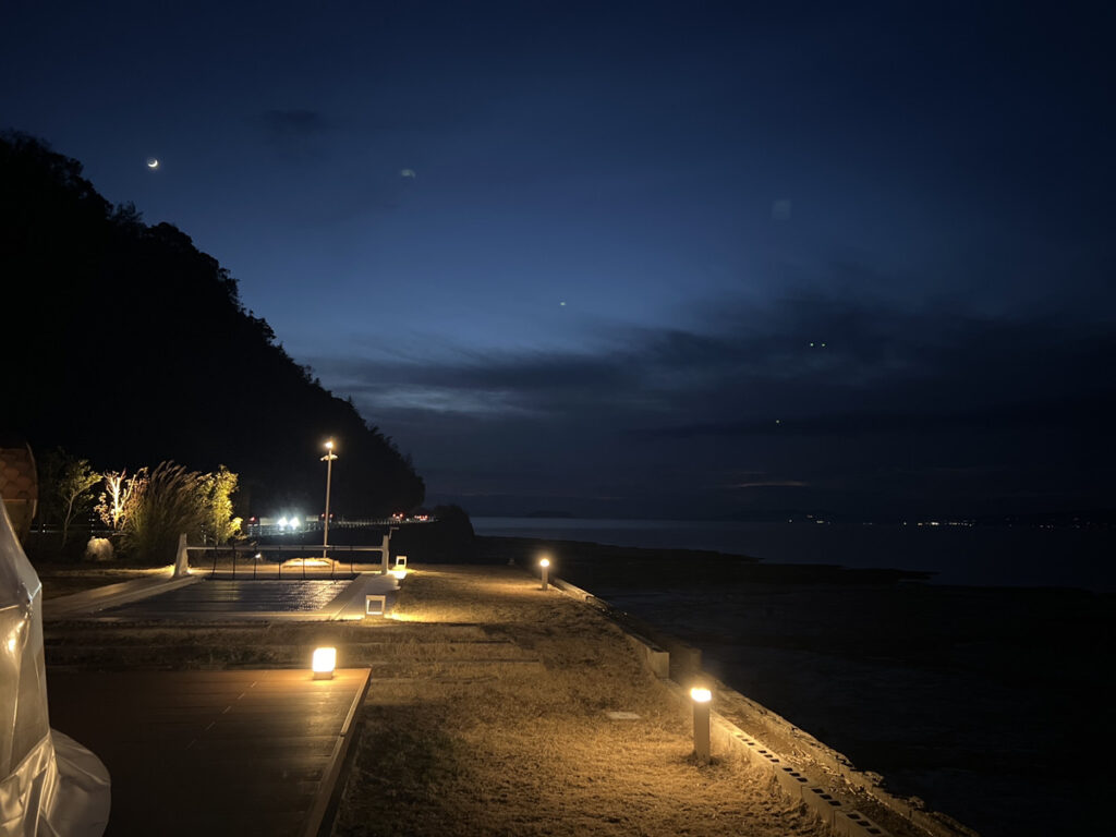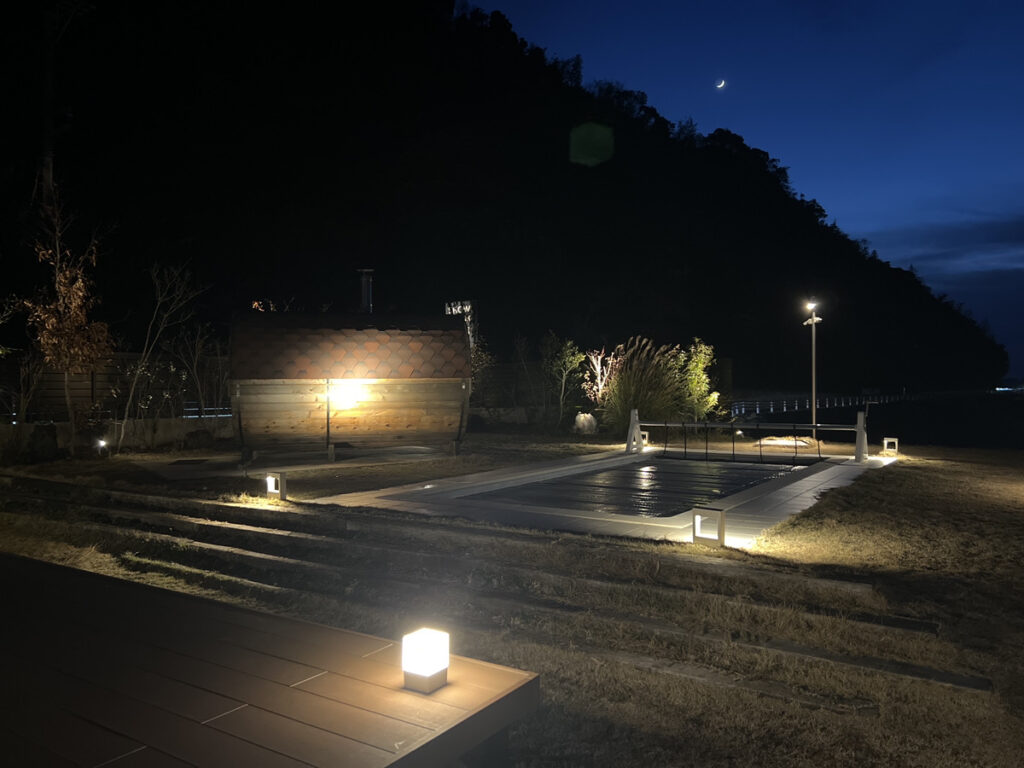 夜空には細い月が浮かび、ライトアップされたプールが幻想的な琥珀色に輝きます。